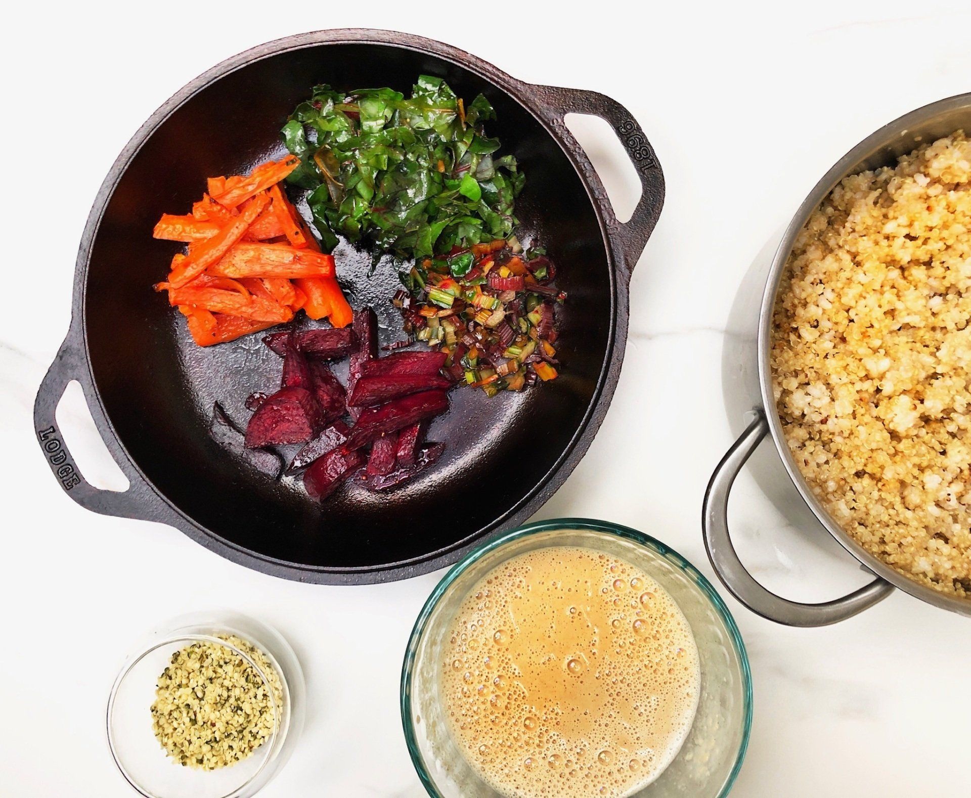 This is an amazing vegan protein rich and satisfying recipe for a delicious bowl. I like to mix the quinoa and brown rice for flavor and texture and then add roasted veggies in this lick your fingers miso ginger tahini sauce. I hope you enjoy!